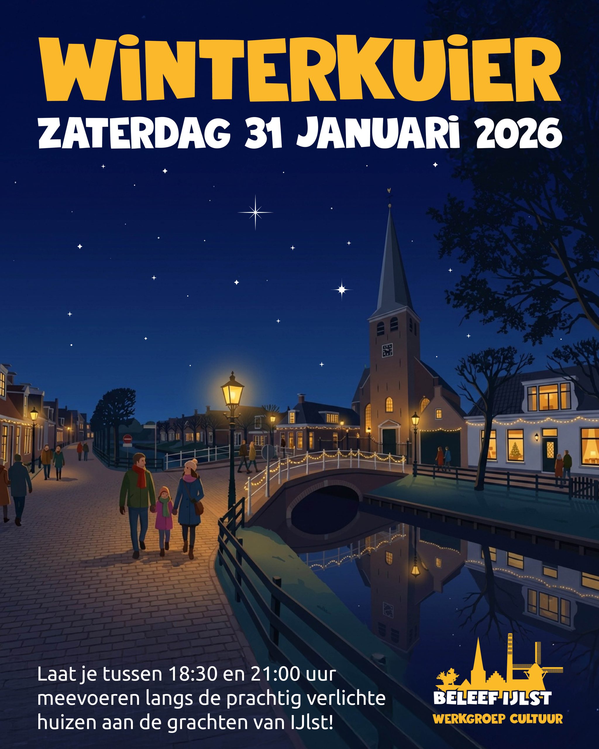Juist in de donkere dagen van januari kunnen we wel wat extra licht gebruiken. Daarom nodigt de werkgroep Cultuur van Beleef IJlst je uit voor een sfeervolle Winterkuier door IJlst.